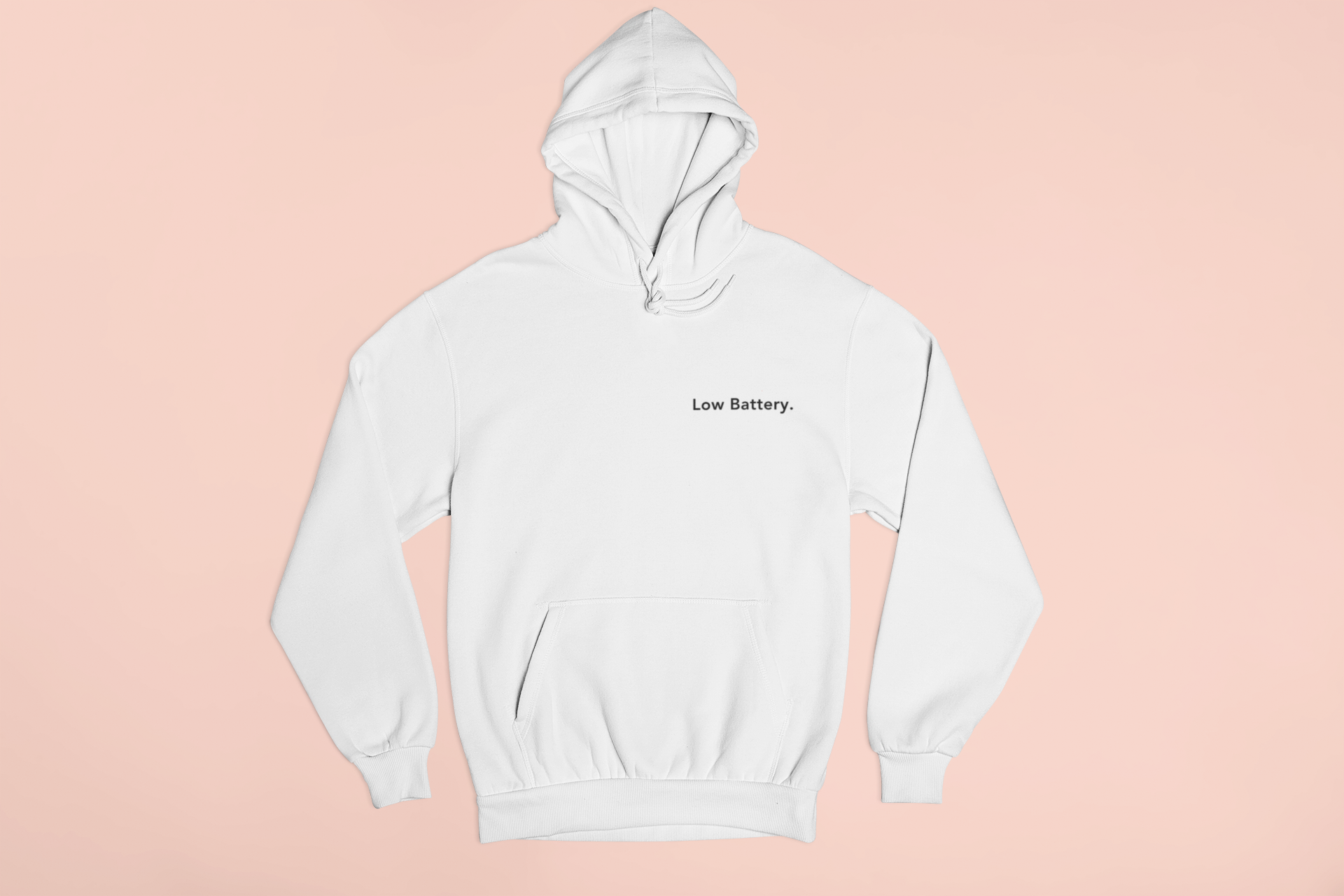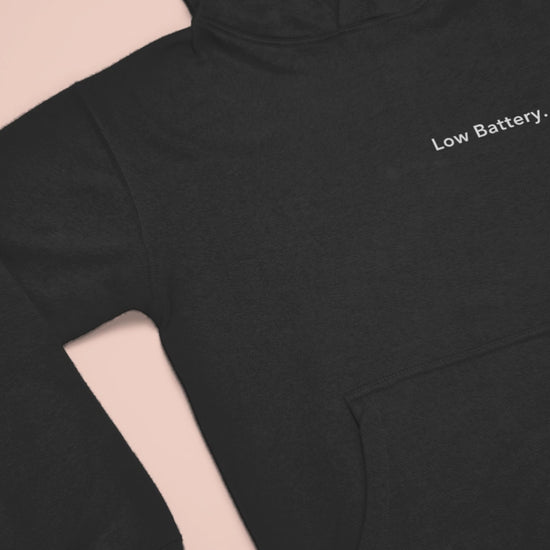 A clean, minimalist hoodie with pocket embroidery that quietly says it all — Low Battery.
