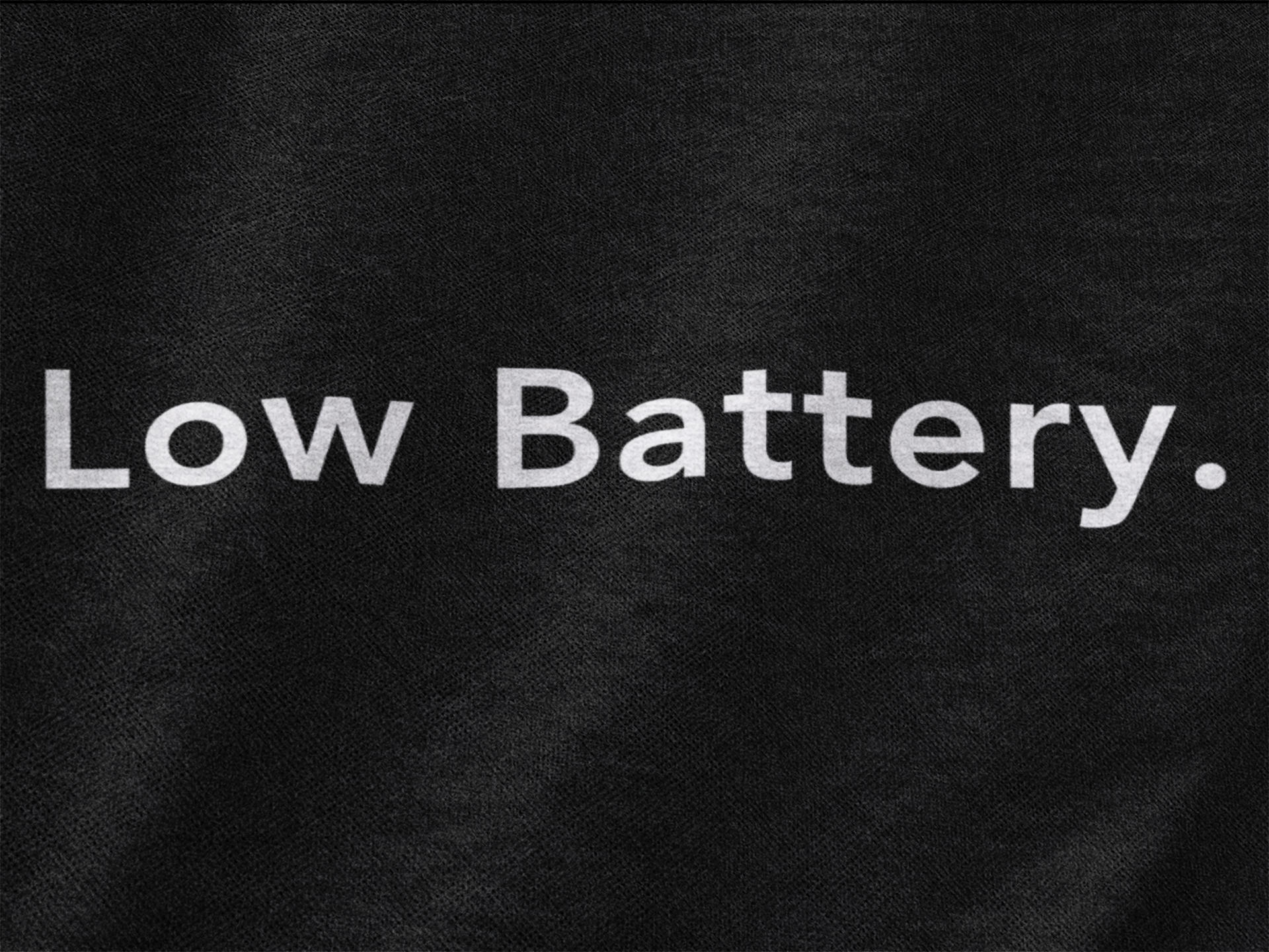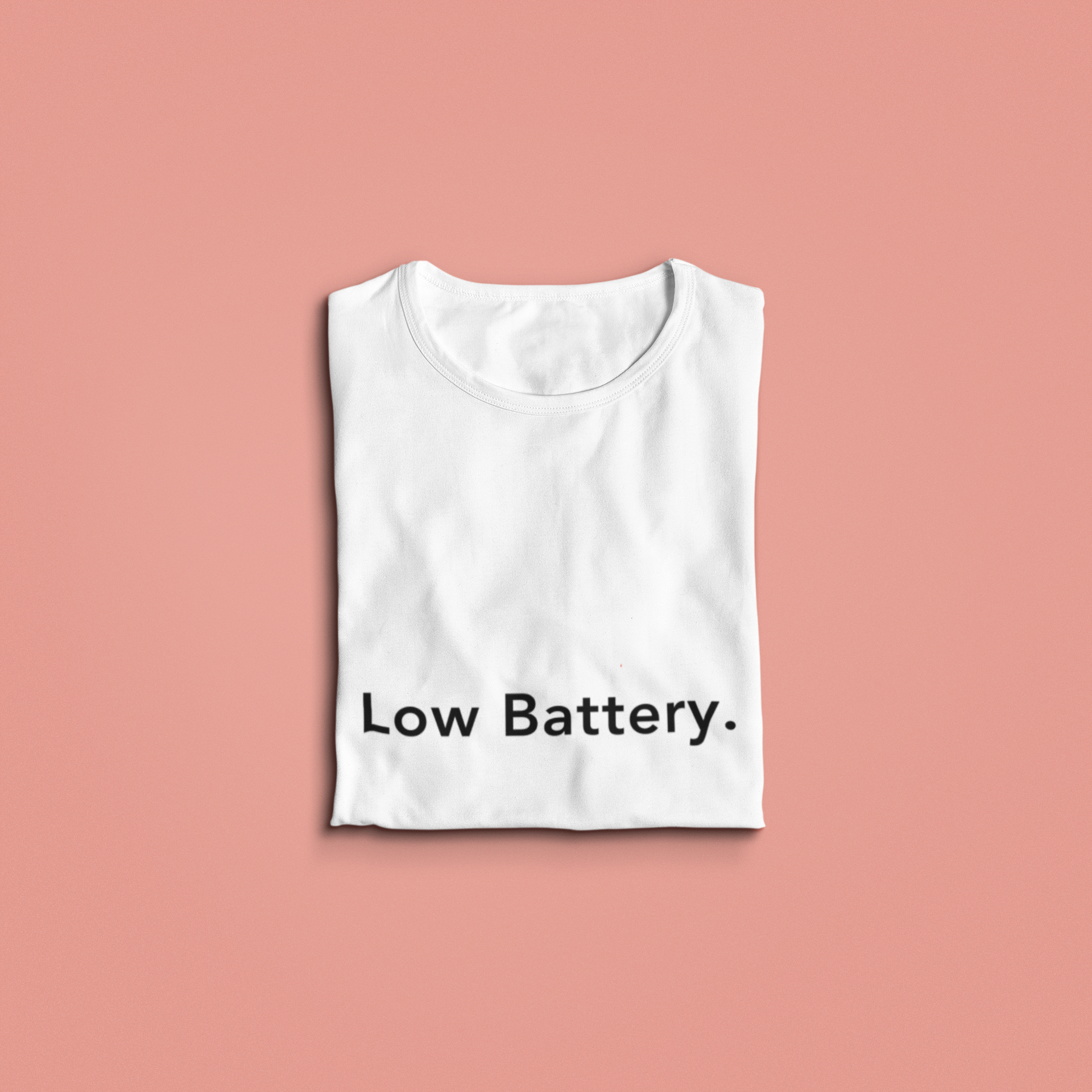 The Low Battery. Tee is printed front and centre — clean, graphic, and impossible to miss.
